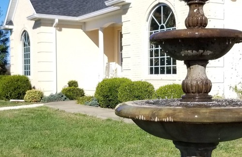 Wine-inspired B&B connected to the Bluegrass vineyard and winery. The home is easily accessible to I-65, yet is quietly nestled in the countryside among rolling hills. A beautiful 3-tiered water fountain greets you at the entrance. There are three bedrooms, with one King and two Queen beds, full kitchen, laundry, and living room area with a sectional and a large eating or gathering area for small get-togethers. Come enjoy a sampling in the tasting room and receive $1 off per bottle discount for being a guest!