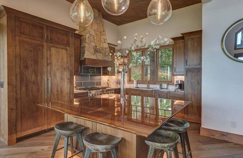 Kitchen - fully equipped main level kitchen, custom wood cabinetry, wood ceiling detailing, granite countertops, breakfast bar seats 4, live edge island, Thermador wood paneled appliances, Bosch dishwasher, custom stone hood, pot filler, kitchen utensils, rustic modern table and glassware, microwave drawer, crockpot, toaster, blender, mixer, Ninja Creami, table settings, Keurig Duo, plus additional drip coffeemaker (bring basket filters)