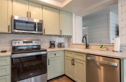 The master bedroom has a Queen bed and a 36-inch flat-screen TV with streaming. It has its own full bath with a single sink vanity and walk-in shower. The second bedroom has 2 twin beds and access to the full-size hallway bath with a single sink vanity and shower/tub combo. There is a stack washer and dryer in the hallway closet next to the master bedroom. There are hardwood floors throughout with nice new touches. This unit is quiet, and private, and stays cool in the summer. Comfy beds with Nectar mattresses. The complex has ample parking.