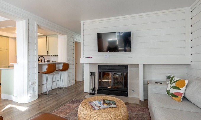 This newly remodeled 2 bedroom 2 bath condo is located in Elkhorn on the second floor of the building and will sleep 4 guests. Updated to create a light, bright cozy atmosphere this unit is all on one level the living area has a gas ignited wood burning fireplace and a 45-inch flat-screen TV with streaming. There is access to a small deck with a table and 2 chairs. The kitchen is fully stocked and has stainless steel appliances. The dining table has bench seating for 4 and there are 2 bar stools at the kitchen countertop.