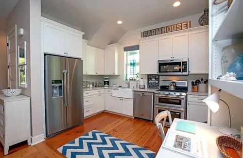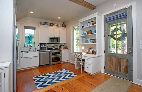 The two-story house - constructed with repurposed wood - is furnished and decorated in modern coastal farmhouse style, contains 3 bedrooms and two bathrooms. Reminiscence of a slower paced time, a feeling of calm and relaxation will engulf you while you still have all of the amenities required for today's fast paced lifestyle.