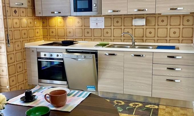 There\'s an equipped kitchen, it\'s fully stocked with all the necessary tools for a comfortable stay, featuring a dining table that accommodates up to 6 people.