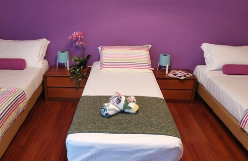The apartment consists of 1 triple room, 1 single room, 1 room with 2 separated beds, a large living room with double sofa bed, a separated and equipped kitchen area , 2 bathrooms with shower.