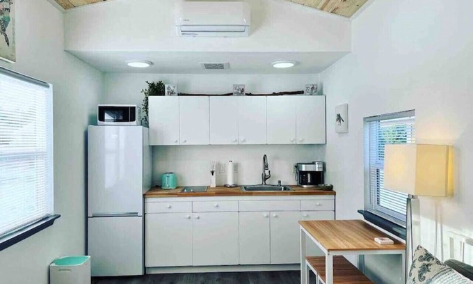 When you arrive on the property you will be welcomed by an open gate propped up by a classic wooden wagon wheel. The driveway leads past the main house and an attached garage (not accessible to guests). Then on the other side of the garage is the tiny house. The space also offers a comfortable queen bed with a smart tv also the convenience of a fully private, 6-foot fenced-in backyard featuring a luxurious hot tub, a cozy outdoor fire pit, and a spacious gas grille