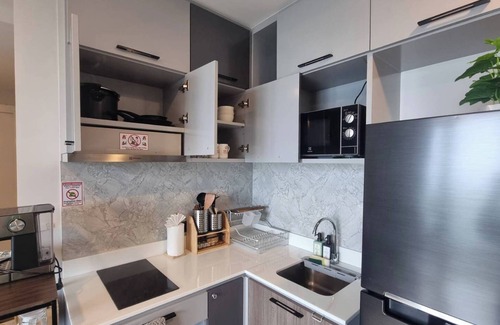 2. This 2 bedroom/2bathroom apartment has total area of 63 sqm and it has been well furnished with all the amenities/appliances to accommodate your stay with full kitchen (microwave, refri, electric stove, dish washing sink, toaster, rice cooker, kettle, plate, spoon, knife, wine opener, pot, fried pan and other stuff) for you to cook your light meals (do not cook heavy meal please, the smoking alarm will be alert). Espresso coffee machine with coffee powder for you to enjoy coffee whole day (available free at coffee corner at reception). We do also provide hybrid dinning table with eco-chairs for your long-hour online working with fiber optic lan wire to ensure you have very strong internet to work whole day and night.
