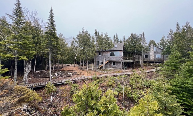 Welcome to your private getaway, where comfort meets nature. Nestled in a tranquil setting just 2 minutes (1.4km) from Tobermory. Boardwalk Pines is a unique and peaceful retreat perfect for families, couples, or small groups looking to experience the beauty of the Bruce Peninsula in style. Experience the property's breathtaking boardwalk—an unforgettable path from the main cottage through the forest that opens onto a private cliffside deck with panoramic views of several islands.