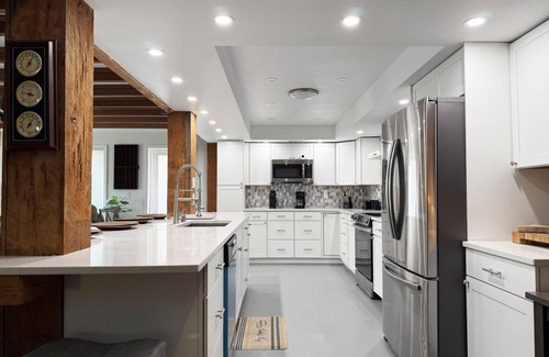 • Updated kitchen with rustic brick fireplace wall and cabin-style charm