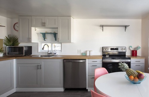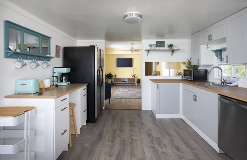 After 20 years of ownership and many upgrades along the way, we are excited to give others the opportunity to experience our “favorite place” and the joy of being oceanside on Geiger Key! With the quaint charm of the “Old Keys”, our home is located in a quiet neighborhood on a dead-end road. It has been lovingly updated over the years and is a true tropical abode. The inside is open, airy and full of natural light. Sliding glass doors on the porch open into a lovely, bright living room, which is open to the kitchen and a sweet breakfast nook. The kitchen overlooks our backyard canal and the breakfast nook has a large window that looks directly out at the Atlantic Ocean. It could serve as a great space in which to work for anybody doing so remotely.