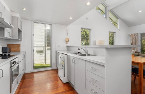 Boathouse Two is a three level home. You enter via the front deck through bifold doors into the open plan living, with well equipped kitchen and comfortable lounge and dining areas. On the next level you have the second bedroom, with a queen and single bed, and the combined laundry and bathroom. You also acess the backyard through the laundry. On the top level is the master bedroom, which is loft style (open, yet private), with an ensuite and walk in robe. Very stylish, and very comfortable! The lounge area has a combustion wood stove for creating great warmth and ambience on a chilly day.