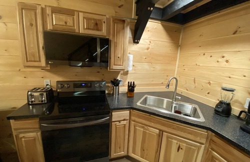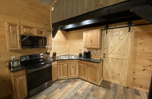 A rustic- modern spin to the ever-growing Barndominium movement, finished out to give a unique cabin feel. We utilized as many local materials as we could, from the pine shiplap walls, to the Amish sawn beams and steel siding. Bobcat Corner features two sleeping areas that both include queen size beds, smart tv's, and WIFI for your entertainment. This barndo would be considered a studio by definition, as the sleeping areas DO NOT have entry doors, although this is a studio, we have designed it in a way that you feel a sense of privacy in your area. A bathroom containing a swedish wall hanging vanity and linen closet is complimented by the custom shower stall and sliding barn door. The full kitchen boasts Hickory cabinetry and a custom epoxy countertop, adequate for all your cooking needs, a four-person dining table completes your dining area. The living area consists of a Top grain Italian leather sofa and ottoman, as well as a Seasonal Propane Fireplace and Large HDTV.