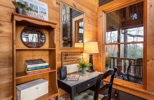This charming cabin is graced with a wall of windows on the main level letting natural light permeate the living room and upstairs loft bedroom. Guests will find the stone wood-burning fireplace or outdoor wood-burning fire pit a wonderful place to gather. The wrap-around deck includes covered and uncovered areas to enjoy the wooded and seasonal mountain views and lovely sunsets while relaxing or grilling on the deluxe gas grill.