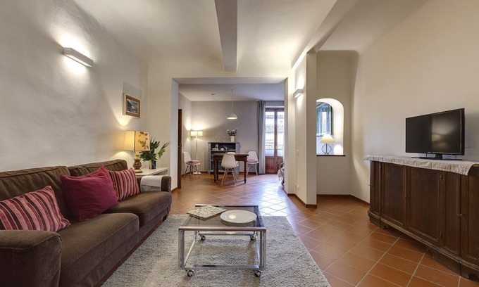 Quiet apartment for max 5 people located in the historic center of Florence, 5 minutes walking to Ponte Vecchio, in an authentic Florentine area, called 'Oltrarno'. 15 minutes walking from Uffizi and Duomo The apartment is on the 2nd floor, No Elevator (40 steps), and it is made up of a fully equipped kitchen, one double bedrooms, with double bed, bathroom (with tub a shower fixture), a large and full of light living room with a double size sofa bed and chair-bed, a dining area looking on a small and quiet courtyard, closet with the washing machine. Floor in 'cotto fiorentino' and parquet. Very quiet. Tv, internet wireless, independent heating, hot-water, washing machine, bed linen and blankets, table linen, bath towels, pots and dishes, electric oven, microwave, fridge, freezer, iron, iron-board, hair-dryer. You can get the best out of your holiday in the city