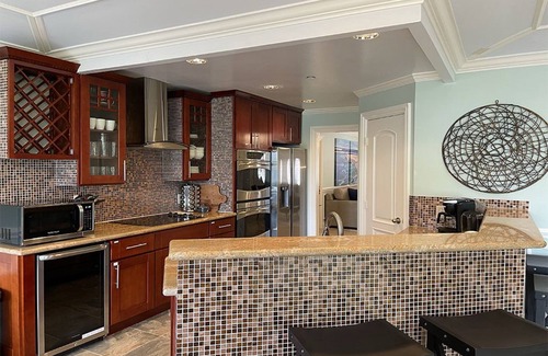 Your gourmet kitchen is fully stocked with a wine fridge, pots, pans, spices, salt and pepper, oil, air fryer, instapot, oven, microwave, toaster, waffle maker, blender, baking sheets, butcher block cutlery, Keurig k-cups, bring your favorite pods and sweeteners as we do not provide them.