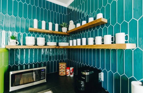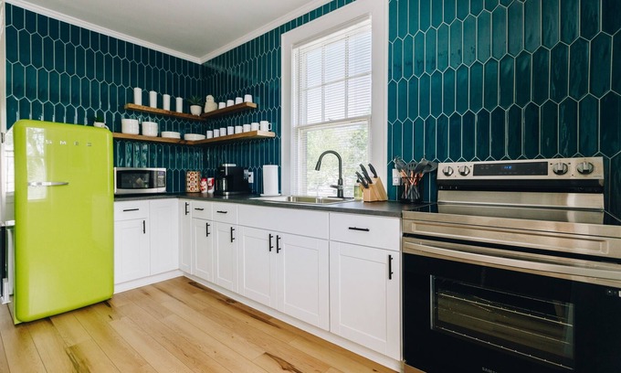 Stay in the most unique and stylish rental in Rock Hill. Located within walking distance to everything our city has to offer, this unit was custom designed by Blue Pineapple decorators with our guest's experience in mind. Work remotely on the 27" computer monitor and 47" desk, enjoy cooking a meal in the aesthetically beautiful, fully stocked kitchen with it's peacock colored picket tile and bright green SMEG fridge, or snuggle up on the chaise lounge sofa complete with comfy accent pillows to catch up on your favorite shows/movies on the 55" Samsung Smart TV.