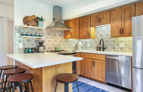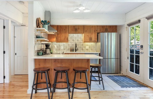 The unit has new countertops, appliances, tile backsplash, shelving, extended island and most everything from cookware to utensils. It is smaller but fully-functional. We love cooking there and hope you will too! We extended the peninsula and use the four stools around it for family meals.