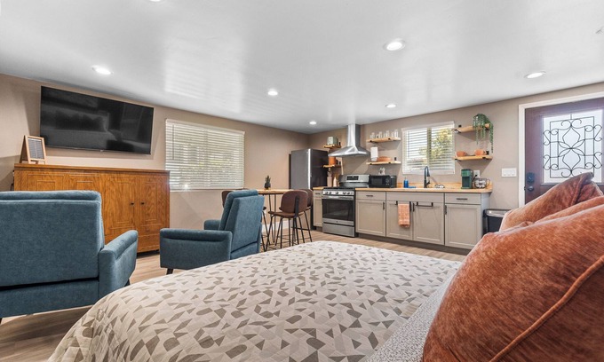 Escape to our chic and stylish studio, designed with a modern Art Deco touch that promises a relaxing and private retreat. Whether you're looking for a weekend getaway, a staycation, or a comfortable spot while in town for work that is close to downtown Visalia area, our space offers the perfect blend of comfort and convenience.