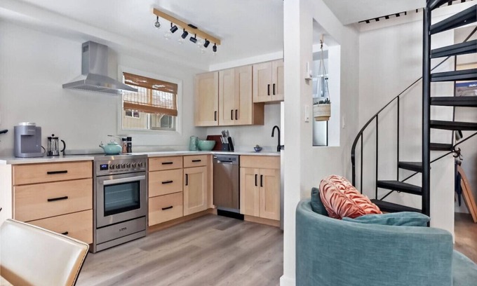 The space is a loft style, A-frame design that has a room upstairs with a queen bed and kids play/reading nook. There is a 45" TV, sitting area, dedicated workspace, and a balcony. The balcony has butte views and a hammock chair to relax in while enjoying your morning coffee. The small but mighty kitchen is sure to delight the chef with it's quaint dining area that is open to the living room. The living room has a cozy couch to watch the 55" TV. There is a full size Murphy bed in the living room for additional guests or the kids. The modern bathroom is freshly renovated and has a shower/bathtub combo. There is a closet with washer and dryer along with small kitchen appliances, safety items, additional dining chairs and bedding for the Murphy bed. The apartment is approximately 701 sq ft.