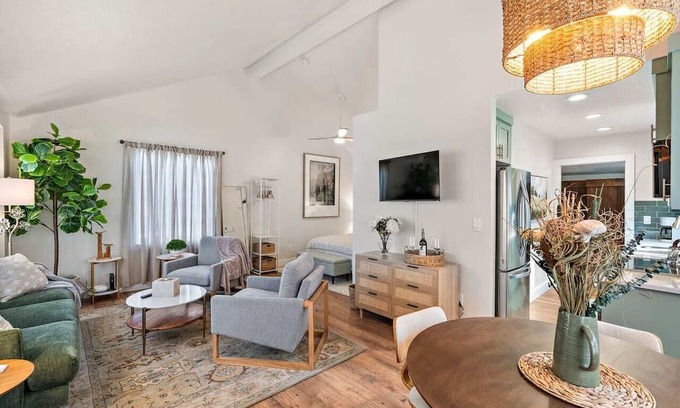 Boise Bungalow is a classic historic Boise home fully renovated in 2024 including the addition of a 4 person hot tub. This single level studio home is ideal for a romantic get-away or a long term stay by a single person or a couple. The entire house has been professionally decorated to create a beautiful calming space for relaxation. The kitchen is well equipped with virtually everything you can imagine for meal preparation. A Roku streaming TV in the living room will help to keep you entertained. The ductless minisplit above the kitchen table keeps the house comfortable all year round with both heating and cooling functions. The house is equipped with the fastest internet speed available in that area. Hyde Park is a short walk away for your morning coffee at Hyde Perk or a great meal at one of the many dining establishments.