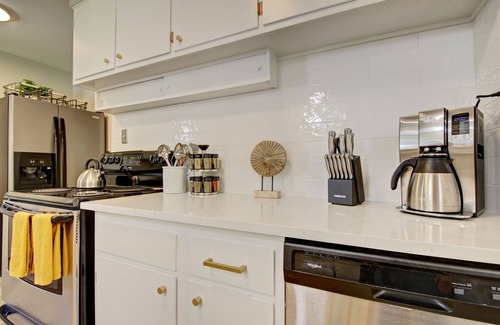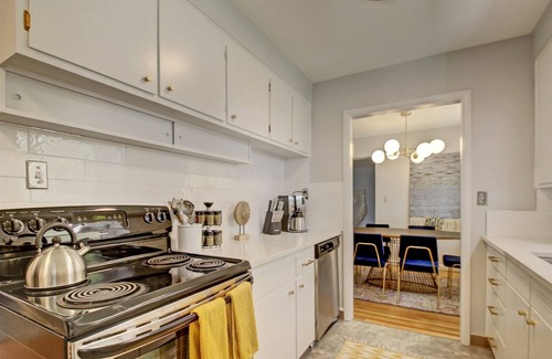 Kitchen: Fully equipped kitchen with ample cupboards, cabinets, dishwasher, and electric range.