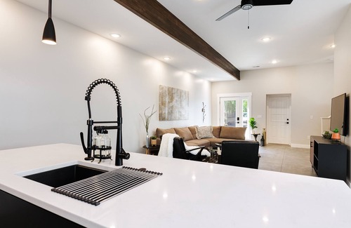 The living room: This open concept room features a comfortable sectional couch, two plush leather armchairs for you to curl up in after a long day of exploring the Greenbelt. The flooring is architecturally designed cement and your eye is immediately drawn to the multiple glass doors leading out to our saltwater pool. The room is awash with light coming from the recessed lighting lining the ceiling over the couch. A 58-inch flat screen television to enjoy shows with your Netflix or Hulu subscription or local channels with the provided antenna offers your evening entertainment.