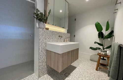 Both bedrooms are well-proportioned, with comfy beds and inviting coastal stylings and built-in robes. The master suite includes a large balcony slider, allowing natural light to filter through, a private ensuite with contemporary finishes, while the second bedroom is serviced by a stylish main bathroom.