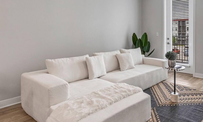 Welcome to your beautifully furnished 1BR/1BA haven at Bold on Blvd! Open the door and embrace modern living in the spacious living area. The open-concept layout seamlessly blends comfort and style, with sleek vinyl plank flooring creating a light and airy feel.