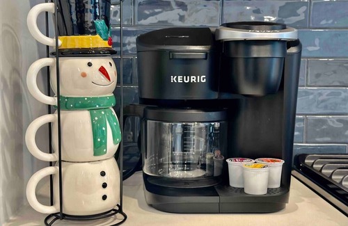 The kitchen, a chef's delight, is fully equipped with brand new stainless steel appliances and stocked with everything you need to prepare delicious meals. From pots and pans to utensils, our kitchen has it all. Coffee and tea aficionados will find their haven here, with complimentary provisions to start your day right.