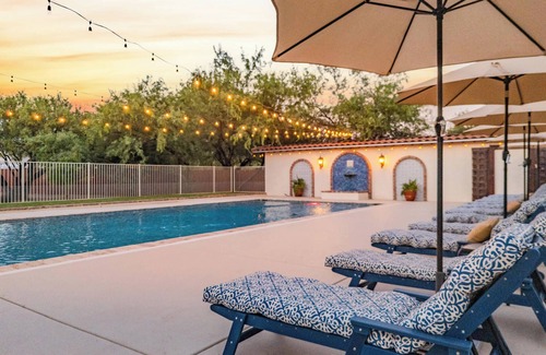 Solana Spanish Villas is a private estate with 6 houses on a stunning 5.7 acre oasis unlike any vacation rental in Tucson. Unwind in the resort-style heated pool, enjoy a game of pickleball on our private court, or simply bask in the serene surroundings. Our villas cater to families, biking or golf groups, corporate or family retreats, winter visitors, or anyone seeking the ideal vacation home. Discover the perfect place to relish Tucson's beautiful year-round weather. Professionally managed to deliver the comforts of home plus the amenities of a mini-resort. Located in the Tanque Verde valley with stunning views of the Catalina Mountains this private villa offers historic Spanish charm with modern comfort nestled within a mature Mesquite tree bosque, 150 year old Eucalyptus trees, green grass and desert wildlife.