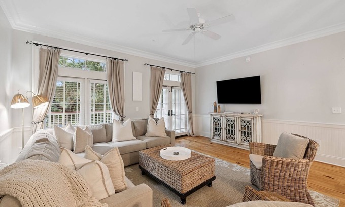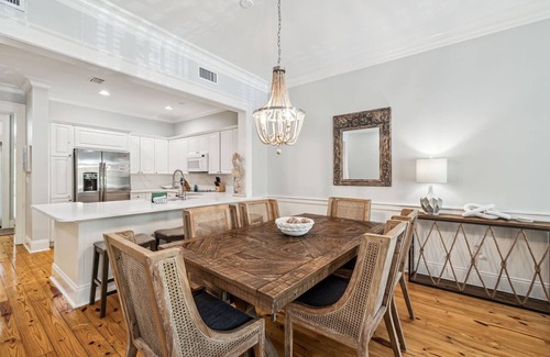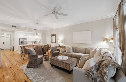 The second-floor living area encompasses a living room, kitchen, and dining room all in one. The living room opens to a covered balcony offering glimpses of emerald Gulf waters and is furnished with a pair of cozy sofas (one a sleeper) and several chairs grouped around a large flat-screen TV. Up to 6 guests can dine at the glass-topped dining table, with a place for 4 more at the adjacent breakfast bar. The kitchen's crisp white cabinets also front the stainless-steel refrigerator and dishwasher and are accented with white quartz countertops. A half bath completes this level. This unit offers the best of both worlds, being just a block from the Town Center, a short walk to Seaside, and an even closer distance to the beach! It's the perfect location for those looking to stay near all of the action. Don't miss your chance to stay in the award-winning community of WaterColor and book today!