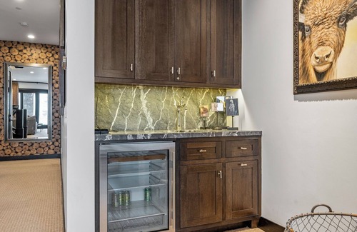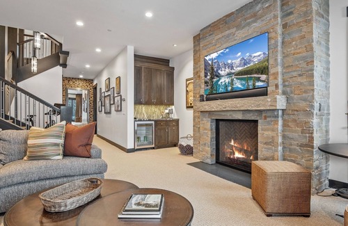 A second living space awaits downstairs—ideal for groups looking to spread out. Mix drinks at the wet bar before relaxing on the sectional. There’s a TV for entertainment above the gas fireplace and another comfortable sectional for movie watching or lounging. Squeeze in a quick cardio session on the Peloton bike. If the day’s plans include hitting the slopes, the Southwest-inspired ski room with lockers, dryers, cubbies, and a bench makes it a luxurious experience and leads directly out to the slopes or to the hot tub for a soothing end-of-the-day soak. This floor’s sleeping accommodations include a guest bedroom with a king bed and 50” TV, and a bunk room with two twin-over-queen beds.