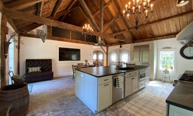 The Farmhouse is designed with your comfort in mind, featuring air conditioning, radiant heat floors, and a gourmet kitchen equipped with stainless steel appliances, including a six-burner gas stove—perfect for hosting post-wedding brunches or family dinners. Relax in spacious gathering rooms adorned with antique pumpkin pine floors or unwind on the gravel patio, complete with a Green Egg Grill and fire pit for evening celebrations. With three bedrooms accommodating up to six guests and additional sleeping options in the loft, this home ensures an unforgettable stay for you and your loved ones.