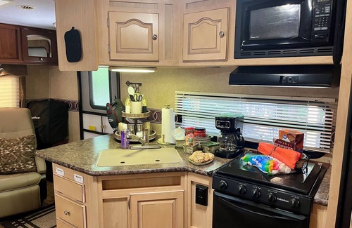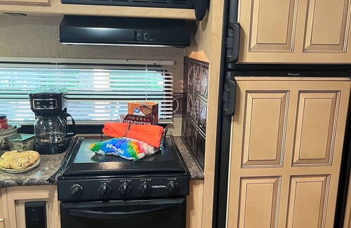 Your cozy getaway awaits in Goshen at this fabulous private campsite on our wooded property! You can enjoy your getaway in our secluded 35” Rockwood camper. The unit offers a comfortable living room with a pull out double sofa bed, and a fold down dinette perfect for the kiddos. This rv can comfortably sleep four adults and two children. Enjoy the splendid amenities which include double recliners, a bathroom with his and hers sinks and a private bedroom with queen bed with mattress topper that makes you feel like you are sleeping on a cloud. Guests can enjoy WiFi, AC, and stereo sound and TV, inside and out. Hot Tub, weight/exercise room, corn hole boards are additional activities available with your special request.