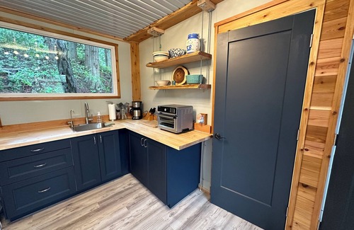 In the kitchenette, you'll find amenities such as a full-sized fridge for beverage storage, a toaster oven, microwave, 2-burner stovetop, coffeemaker, kettle, pots, pans, and a salad spinner for your culinary needs.
