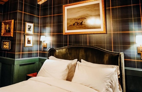Relax in the adjoined sitting room designed with travelers in mind. With hunting plaid wallpaper and a custom velvet queen sleeper sofa, your group is sure to enjoy the added space to unwind after a long day.