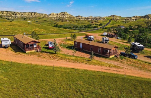 Fully furnished cabin has everything you need for an easy stay. Enjoy awe inspiring badlands from the front porch. This 2BR cabin comfortably sleeps 6 with 1 queen size bed, 2 twin beds and a pull out queen sofa. Guests share 1B with shower/tub combo. Kitchen comes with daily essentials. Minutes to everything Medora has to offer. Bring your horse, bike, and golf clubs. We look forward to your visit!