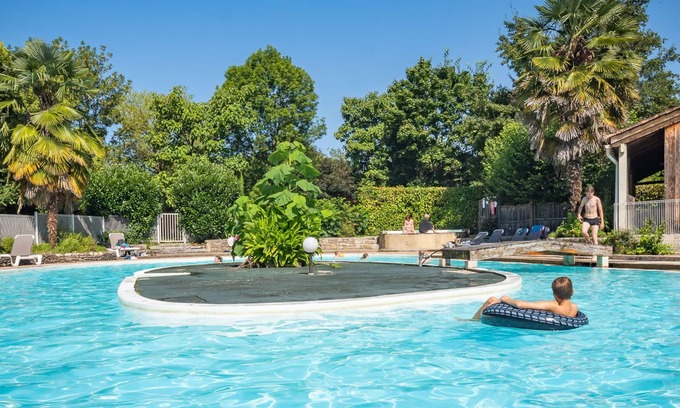 • Piscine ludique avec îlot et pont, ouverte uniquement en juillet-août, non chauffée.