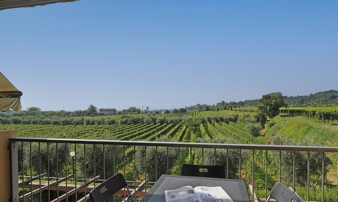 Lovely apartment with private balcony inside a residential complex with shared swimming pool in Puegnago del Garda.The apartment, located on the first floor reachable on foot, opens onto the living room that features a comfortable sofa, dining table with chairs and an American kitchen fully equipped with oven, microwave, electric kettle, juicer, American coffee maker and toaster. French doors lead to the private balcony, equipped with outdoor table and chairs, from which there is a beautiful view of the surrounding vineyards. The apartment continues with a room consisting of a sofa that can be converted into a comfortable sofa bed, television and balcony. The floor is completed by the bathroom with shower and washing machine. Through a staircase it is possible to access the sleeping area consisting of two bedrooms. Both rooms are furnished with a double bed and closet.Guests will have amenities such as free wi-fi, fans, and independent heating for colder days.Guests will benefit from a public parking outside the property.The shared swimming pool is open from the 1st of May to the 30th of September. A swimming cap could be required.*Upon arrival or a few days before arrival it may be required to pay a tourist tax, which varies according to local regulations. You will find your reservation details within the Guest Area of Wonderful Italy.Puegnago del Garda is a small village close to Salò, in the area west of Lake Garda, called Valtenesi, known for its Groppello wine and the olive oil.Thanks to the well-known agricultural productions, it is possible to visit wineries, vineyards and olive groves and to enjoy wine and food tastings, among which traditional gnocchi made with bread seasoned with basil.For sports lovers it is the perfect area to practice outdoor activities such as easy trekking on the hills or water sports in Lake Garda.Close to Puegnago there are smaller lakes, called Sovenigo Lakes: do not miss a visit during the blooming season of the lotus flowers during summer.The airport of Verona can be reached within an hour's drive.