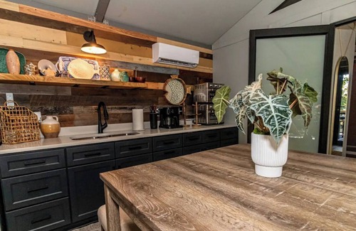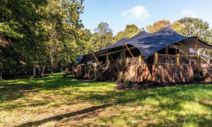 The Boschendal, our largest luxury canvas cabin at Karoo, sleeps eight with two master suites each consisting of one queen bed and one twin bunk bed. Nestled at the waterfront of tranquil Smith Mountain Lake, Boschendal offers spacious accommodation for two families or one large family. The spacious tent includes a sitting area, two spacious bathrooms (one per wing), kitchenette with a full-sized refrigerator, two air fryer's, and coffee machine, 55” Smart TV with wifi, sitting area, kitchen table, private covered deck, private wood-burning hot tub, four burner propane griddle. The luxury canvas cabins are fully equipped with all modern essentials such as heating and cooling as well as hot running water. The perfect combination of exploring nature's finest beauty with a modern, elegant twist. Enjoy the scenery on the spacious covered deck with comfortable outdoor furniture. Want a relaxing dip in warm water? Enjoy your own private wood-burning hot tub just a few feet from your private deck. Feeling friendly? Enjoy the communal wood-burning fire pits or hammocks throughout the grounds of the resort.