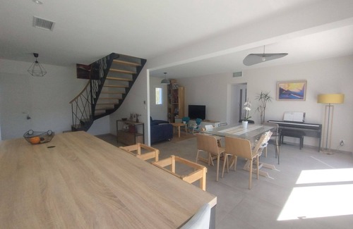 - A living room of approximately 55m²: living room with TV, dining room overlooking the garden, equipped kitchen (Delonghi coffee maker, kettle, toaster, oven, microwave...)