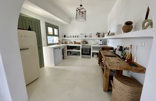 It comprises of two volumes, each of two floors and has both magnificent views to the south and west, as well as a unique inner courtyard lined with high trees. The fuchsia colour of the bougainvilleas combine perfectly with the Cycladic white and the sea blue to create a unique sense of serenity and style. The tastefully restored interiors are extremely comfortable, yet very ‘light’ to the eye, enhancing this calming effect.