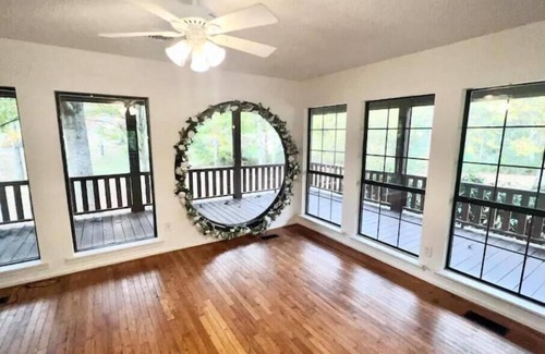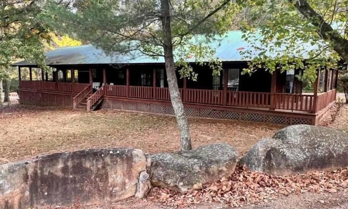 Enjoy the outdoors and nature while staying in this roomy Lodge Cabin at Sweet Springs Retreat. The house is located on a private retreat in Guntersville adjoining Lake Guntersville State Park. It has a private 4-acre lake and an Entertainment Building for guest that includes inflatables for kids, obstacle course, indoor basketball, arcade and more! Feel free to explore the 40 acres for hiking, fishing, and the Entertainment Center. Located less than 1 mile from Guntersville State Park.