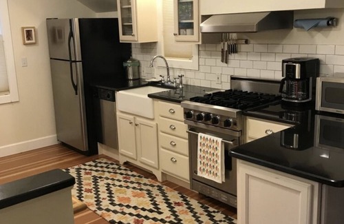 - full kitchen amenities with high-end appliances, including dishwasher, Viking gas range, oven, coffee maker, electric tea kettle, microwave Miele washer/dryer and more