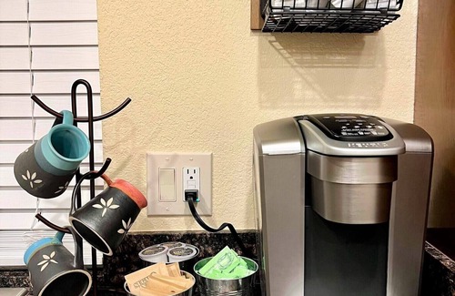 Fully appointed kitchen with stainless steel appliances, including stove, oven, refrigerator, dishwasher, and microwave. Bedrooms are comfortably furnished with fresh crisp new linens, pillows, bed coverings. Master bedroom has one queen bed and a bunk bed. It also features a private en-suite bathroom as well as a private exterior entrance.