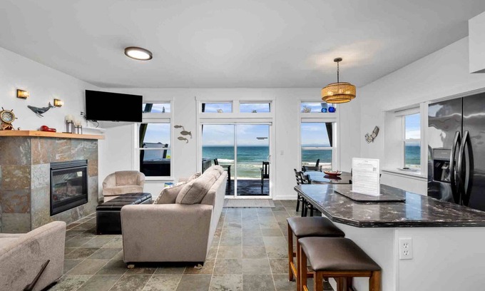 Inside, the condo exudes warmth and comfort with soft coastal tones, wood accents, and white-framed windows that let in abundant natural light. The open living area features cozy seating, a Smart TV, and a fireplace—perfect for unwinding after a day of adventure. Step out onto the deck to soak in the large private hot tub while enjoying the salty breeze and panoramic ocean views.