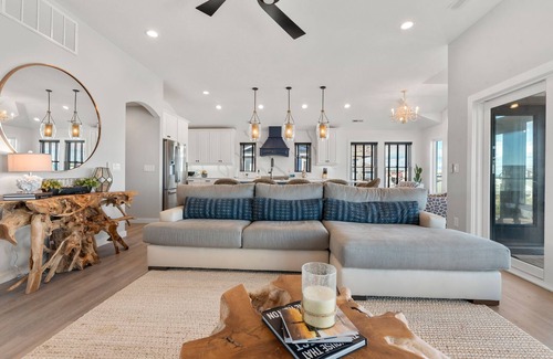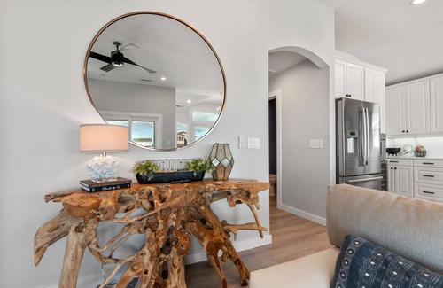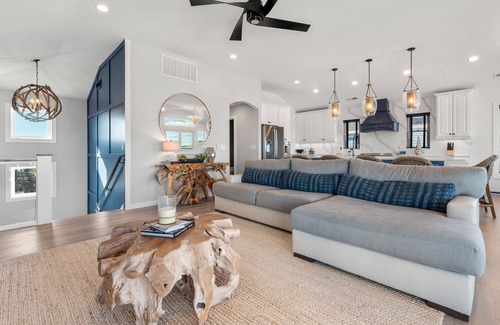 Downstairs. you'll find a bourbon-themed rec space with bar, full size fridge and a custom whisky barrel wall that will get happy hour started anytime of the day. It's conveniently located right off the pool area, along with a half bath. After a day at the beach, the outdoor fun can continue in the backyard. Take a dip in the saltwater pool or a relaxing soak in the hot tub. Use the tiki bar and built-in grill for poolside drinks and cookouts. The barefoot-friendly grass and fully enclosed fencing is perfect for kids. In the evenings, gather around the firepit while planning the next day's adventures.