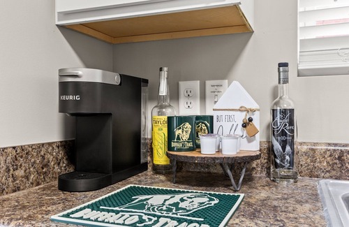 Fully stocked kitchen with pots, pans, baking sheets, Keurig coffee maker, spices, oil, blender, dinnerware and silverware, toaster, and much more. Due to high volume of guests, things tend to run off. If there is something missing in the unit, please reach out to us so we can make your stay a 5-star experience!