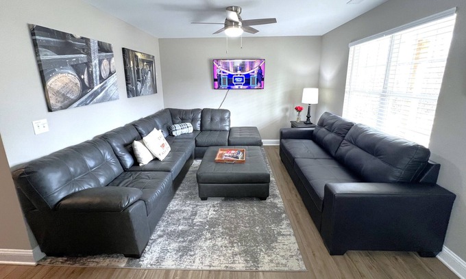 The Bourbon Chaser is your perfect luxury modern getaway to explore all that Kentucky has to offer. This brand-new home features a spacious open layout with 4 private bedrooms, 1 King and 3 Queens, and 2 full baths. Guests will also enjoy a fully stocked kitchen, high speed internet, a back patio with a hot tub and a Blackstone grill, large firepit area, along with a fenced in backyard for privacy.
