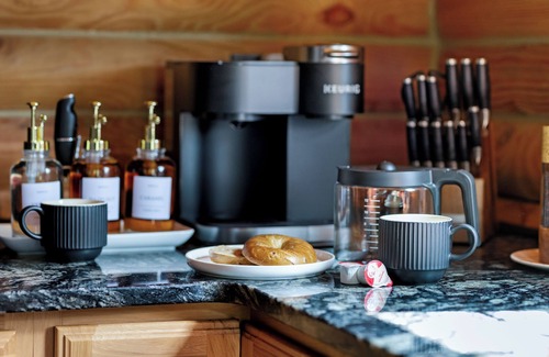 * K-cups, coffee grounds, coffee syrups, sugars, creamers, milk frother