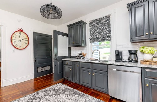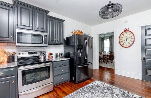 Your stay promises comfort and convenience, featuring an open-concept kitchen equipped with stainless steel appliances, a cozy living space with a plush couch, and high-speed Wi-Fi to capture every moment. Enjoy outdoor cookouts with a gas-operated BBQ grill in the private fenced yard, perfect for mingling with family and friends. Relax in the vintage-inspired decor, complete with antique furnishings that enhance the chic charm of this historic abode. Additionally, our pet-friendly policy allows you to include your furry companions in the celebration, making it a joyful reunion for all.