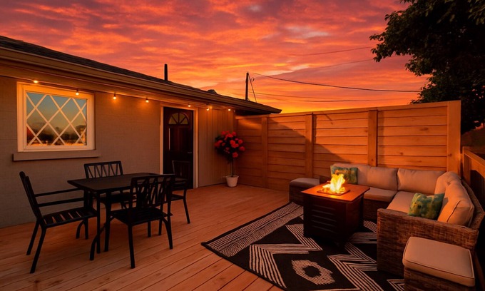 **Outdoor Oasis:** Relax on the outdoor patio with high-end furniture and ambient lighting, perfect for unwinding after a day of exploring.